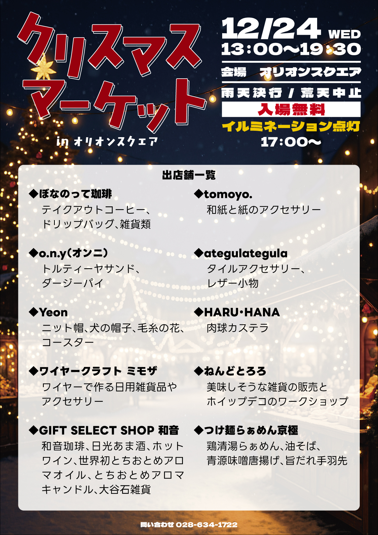 オリオンスクエアでは、12月24日(水)に「クリスマスマーケットinオリオンスクエア」を開催いたします。
