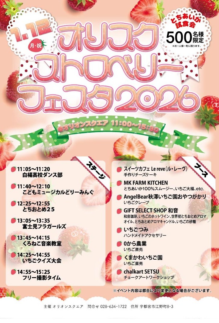 「オリスクストロベリーフェスタ2026」開催のお知らせ2026年1月10日orionsquare皆さん、こんにちは。オリオンスクエア管理事務所です。今年で第3回目となる「オリスクストロベリーフェスタ2026」の開催が近づいてきました!🍓🎉栃木県産いちごを使ったスイーツや雑貨、体験型ブースなど、楽しいコンテンツが盛りだくさんです。出店者・協賛企業の情報をまとめたチラシも完成しましたので、ぜひチェックしてみてください。皆様のご来場をお待ちしております!